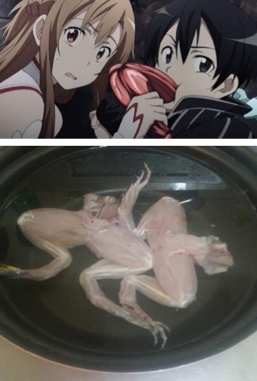 コンコン…((ドアをノック 教授「はいはーい。」 キリト「例の件の報告と相談をしに来ました。」 教授「おー、桐ヶ谷か!! まぁ、座ってくれ。」 キリト「企画書の方はスラスラ書けて問題なかったんですど、、、400字程度と指定があった高校生を対象にした実験の説明が企画書の勢いで細かく書き過ぎて…1200字ぐらいになったんですけど。。。;;;((椅子に座りつつ」 教授「んー、どれどれ?((目を通し 確かに長いなぁ〜;; こんな細かく書かなくてもココとかは省けるし…ココも。。。((修正 まぁ、こんな感じでいいんじゃない?((実験の説明の紙だけ返却」 キリト「ありがとうございます。 んじゃ、また明日直して持って来ます。」 教授「あぁ、分かった。 それはそうと、桐ヶ谷…ちょうど今、研究室の冷蔵庫に冷やしてる肉を持って帰らないか?v これがスーパーとかじゃ売ってない珍しい肉でね〜!!w ちょっと待ってなさい。((肉を取りに冷蔵庫へ」 キリト「は、はぁ…((待機」 教授「これなんだけど・・・食べたことあるか?」 キリト「これは・・・?;」 教授「見りゃ分かるだろ?v ちゃんと料理すれば鶏肉みたいで旨いぞ?b それに珍しいからこの先食べる機会ないと思うし、一本どうだ?v なんならサービスしてもう一本あげちゃうぞ!!!v((袋に2本詰め→渡す/ぁ」 キリト「ぃや、渡されても…;; まぁ、確かにこの先食べる機会ないだろうし…((ェ」 教授「だろ?v んじゃ、立ち話もいいが肉が傷むといけないから早く帰れwb」 キリト「ぃや、せめて料理の仕方教えてくれよ!?;;;」 教授「あー? 適当にやればOK!!!! さぁ、帰った帰った!!!w」 キリト「ちょっ、おい、聞けってぇぇえ!!!;;」 ガチャッ…((ドアの閉まる音/追い出され